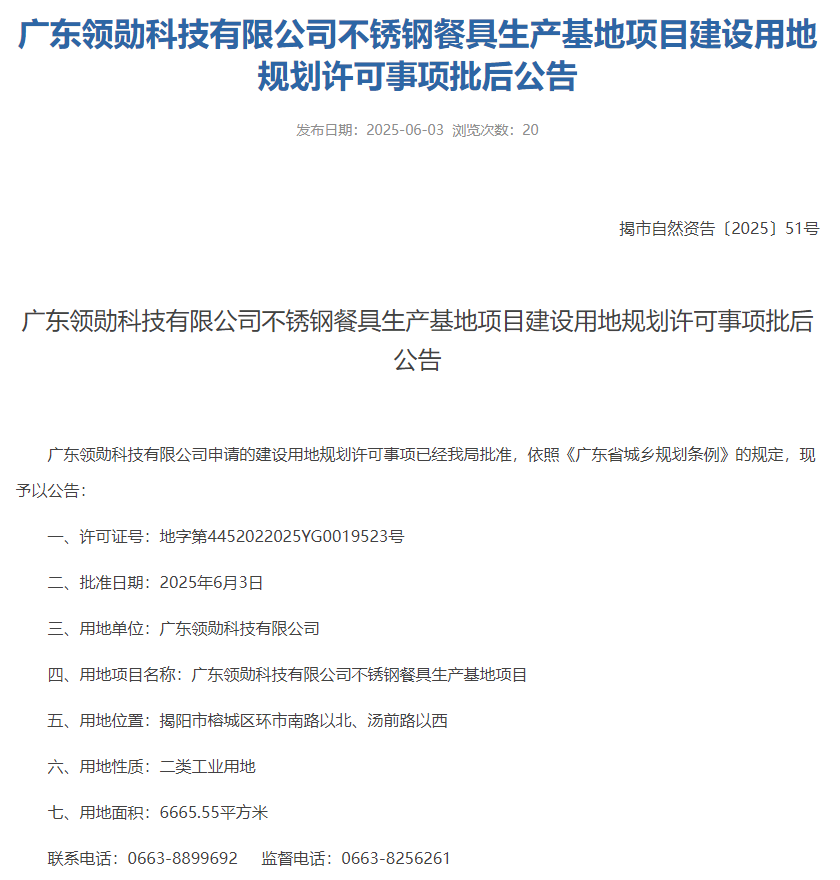 2025年6月3日,揭陽市自然資源局就廣東領勛科技有限公司不銹鋼餐具生產(chǎn)基地項目建設用地規(guī)劃許可事項作出批后公告。